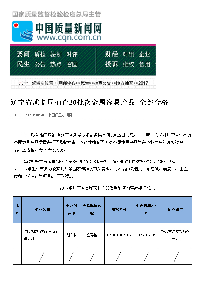遼寧省質監局抽查20批次金屬家具產物全數及格